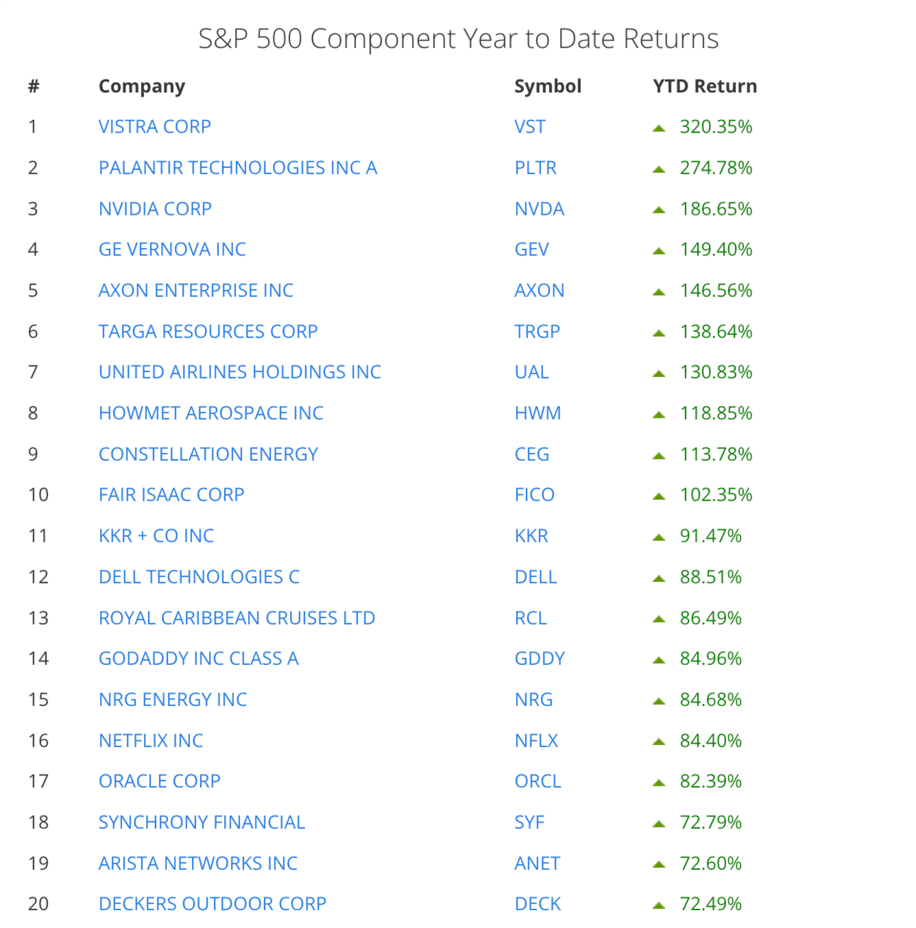 This year has been no exception, and the chart below, courtesy of one of our favorites, Slickcharts, highlights the best-performing stocks in the largest stock market index from the start of 2024 through November 21, 2024.