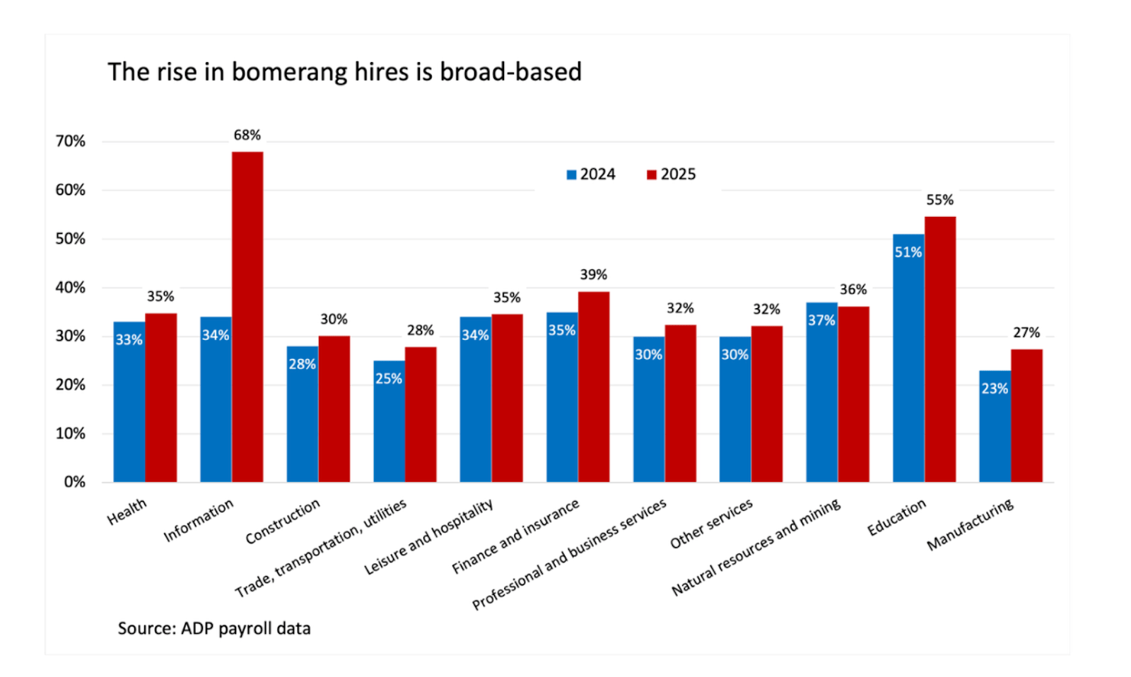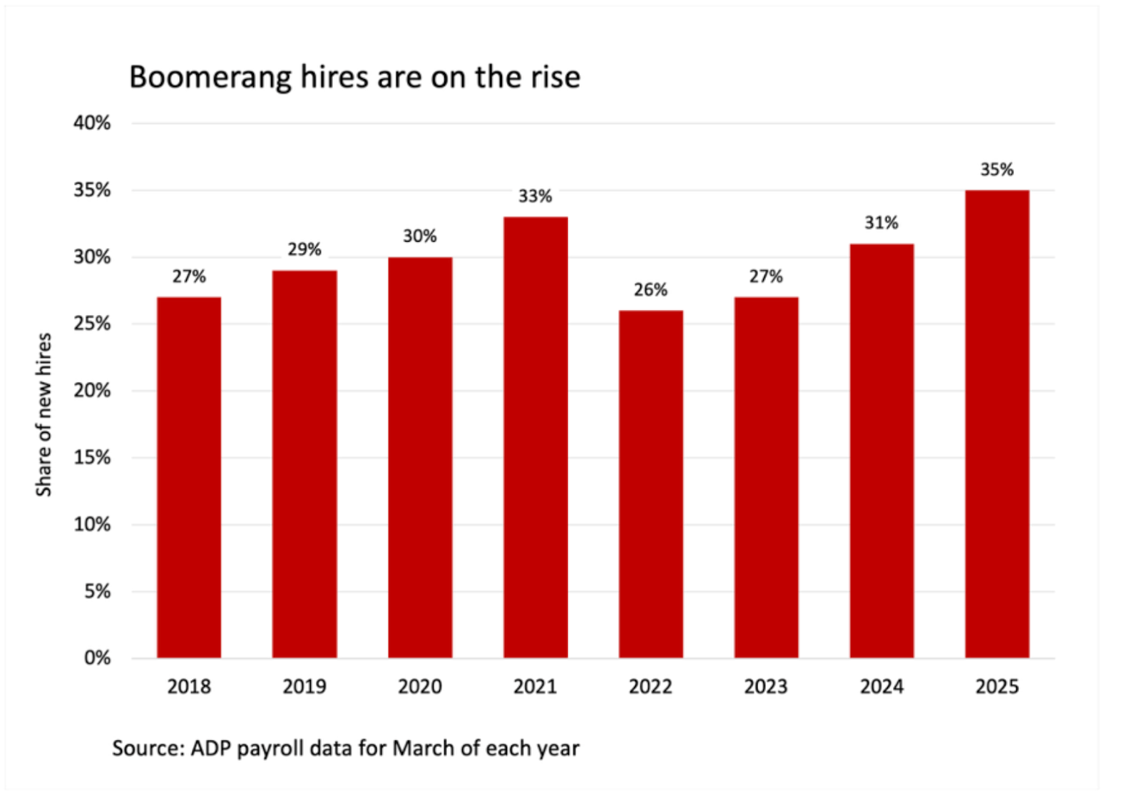“Boomerang” hires have reached its highest share of new hires in the past 7 years, according to data from ADP.