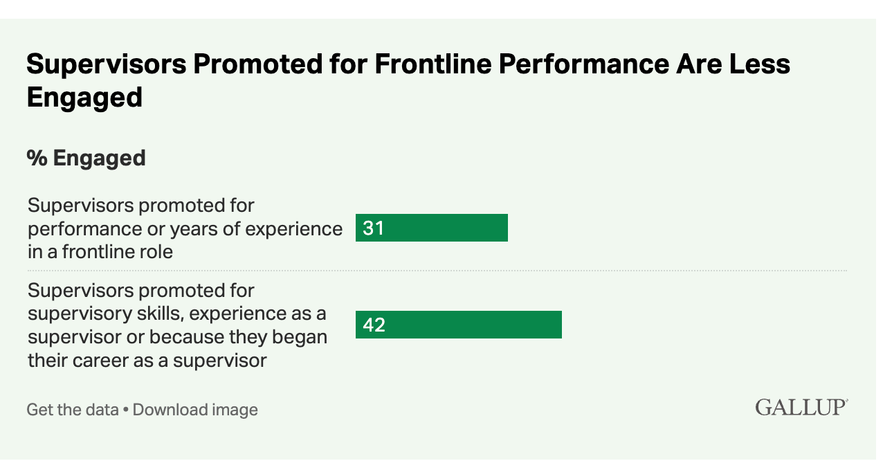 Recent research from Gallup shows that supervisors promoted primarily for strong frontline performance are less engaged than those promoted for demonstrated leadership ability or prior supervisory experience. That disengagement does not remain contained at the individual level, because frontline supervisors shape the daily experience of entire teams. This is not a failure of ambition or work ethic. It is a failure of design.