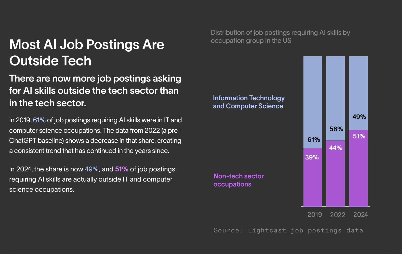 The Lightcast report, Beyond the Buzz: Developing the AI Skills Employers Actually Need, is a highly recommended read. They’ve analyzed millions of job postings to see what employers are actually paying for. In 2019, 61% of AI-related job postings were in IT and Computer Science. In 2024, that dropped to 49%. That means more than half of AI jobs are now outside tech. Marketing. HR. Finance. Sales. Customer support. Education. If you’re in one of those fields and still telling yourself, “I’m not technical,” the market has already moved past you.