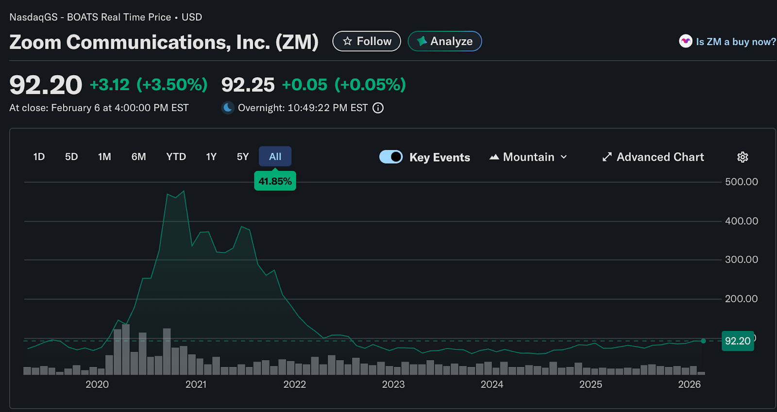 Zoom reached its peak stock price at the height of the COVID-19 pandemic. It was dumped by long-term and short-term investors as return-to-office policies were implemented. However, despite a severe slump in many software stocks like Adobe and ServiceNow, Zoom Communications, Inc is up nearly 7% year-to-date as of February 9, 2026. Over the past 6 months, there has been a slow uptrend in Zoom’s stock price.
