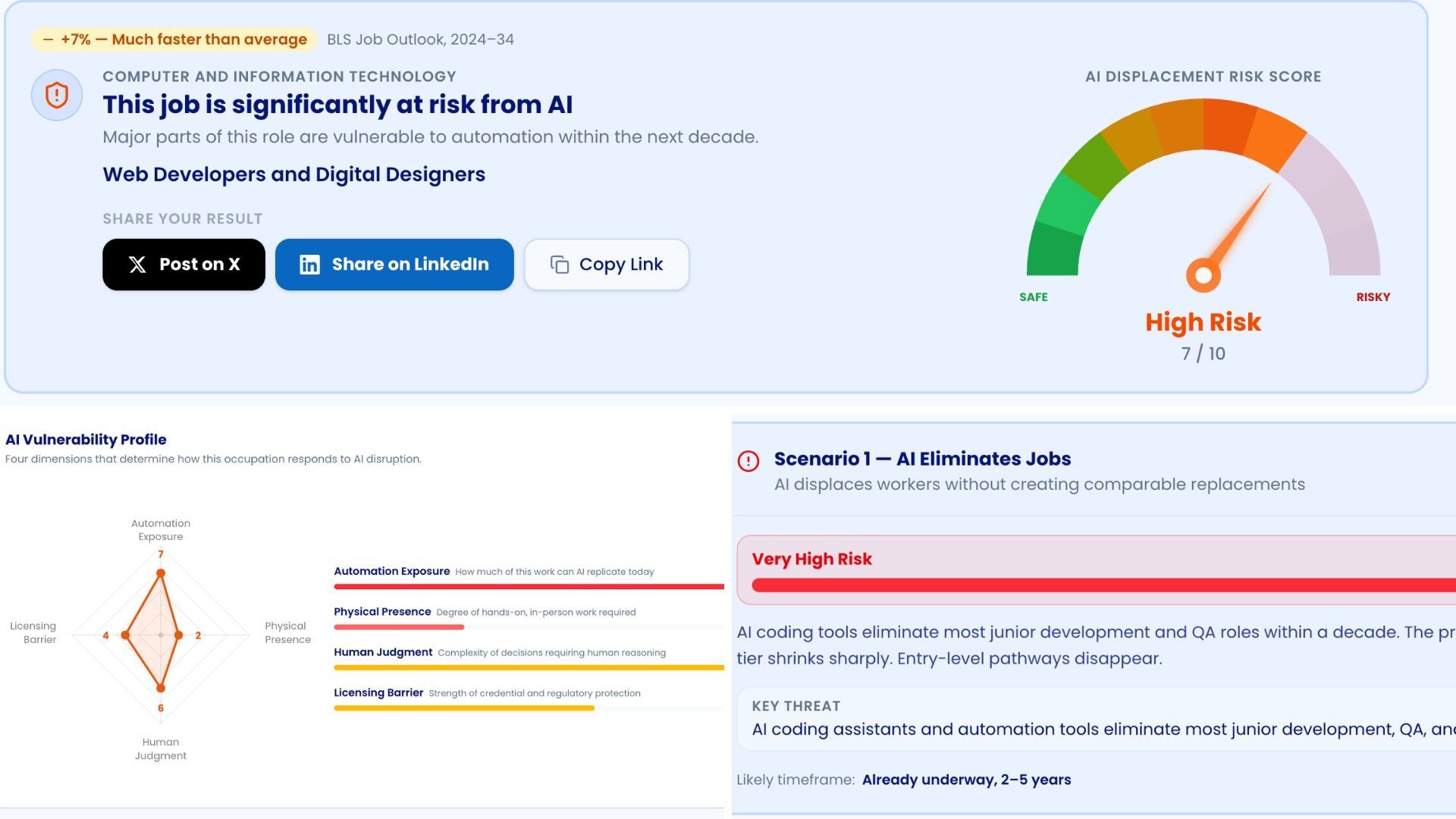 We explored a version of this in Chapter #61, when the Anthropic Economic Index showed that AI goes after the high-skill tasks first, like research, analysis, planning, and not the grunt work. This tool gives you the next layer with your specific occupation, your specific exposure, across all three possible futures.